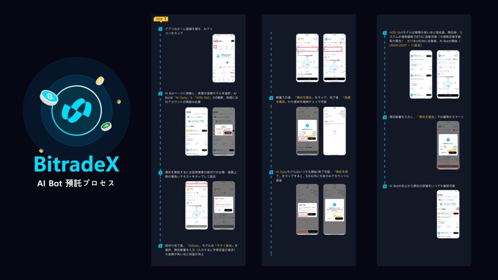 この記事ではBitradeXで高利回りを目指せる仕組み・メリット・リスク・注意点までわかりやすく紹介し、初心者でも始めやすい最新のAI資産運用情報をまとめています。