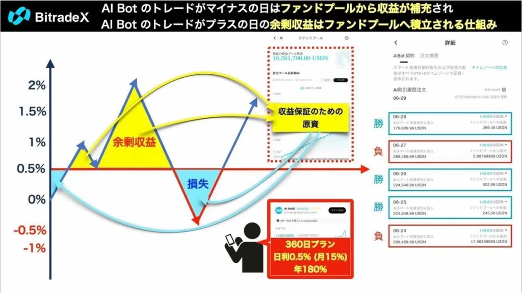 BitradeXは単なる資金集めの詐欺とは構造が明確に異なります。 最大の安心材料は「ファンドプール」による独自の損失補填システムです。AIの取引で利益が出た日に余剰分をプールへ積み立て、万が一マイナスになった日はそのプールから自動的に損失が補填される仕組みになっています。