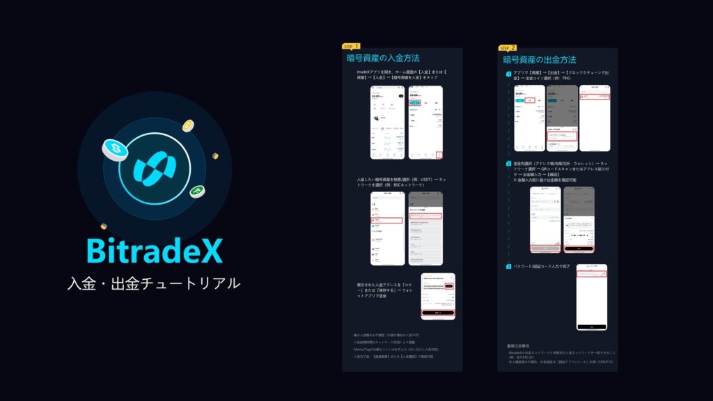 BitradeXでの「交換(両替)」と「振替(金庫から財布への移動)」の具体的な操作については、こちらの解説動画が非常にわかりやすくまとまっています。
